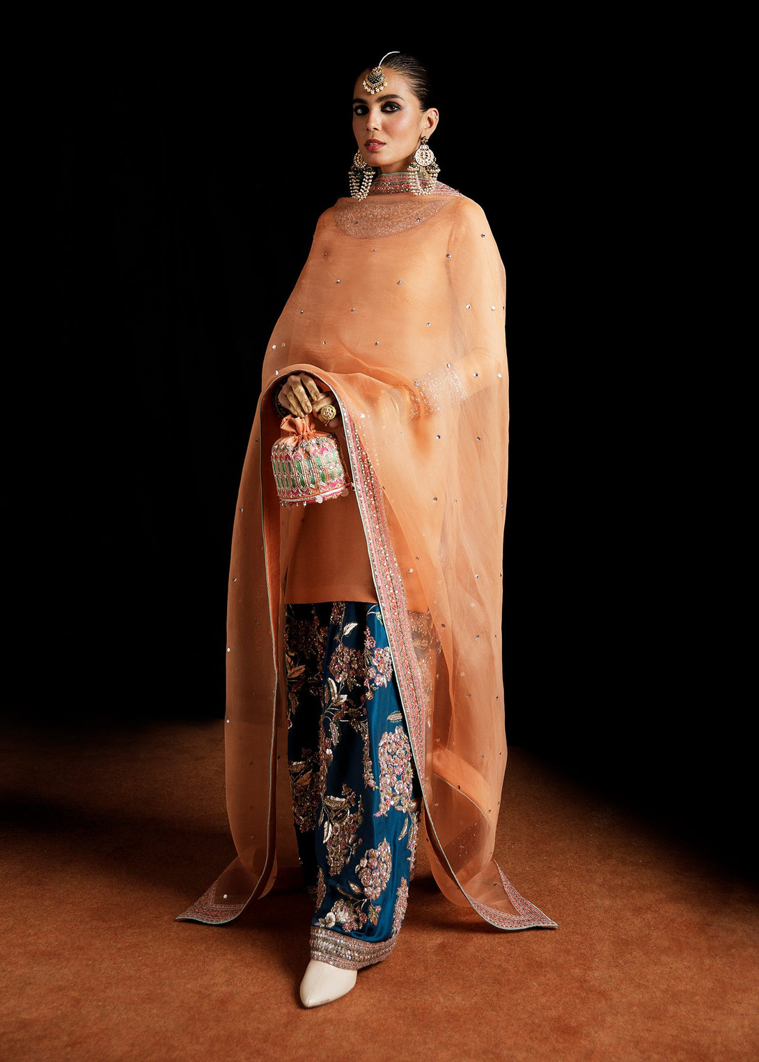 A decent peach raw silk shirt with intricately embellished neckline and sleeves at the ends, it is paired with a raw silk teal blue shalwar heavily embellished shalwar with intricate, dainty details of silver mukaish, silver nakshi, silver sequins, silver dabka, and orange, pink and green buggle beads. It comes with an pistachio organza dupatta with multihead borders on all four sides and sequin chatta all over it.