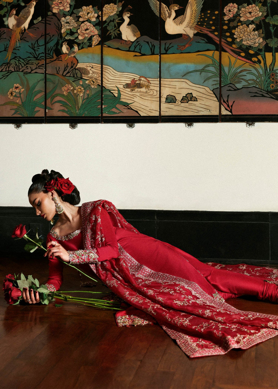 A long red raw silk straight-cut shirt, adorned with multicolored floral embroidery and embellishments along the neckline, fitted sleeves, and cutwork hem. Paired with a matching churidar and a richly embroidered organza dupatta, finished with satin silk borders.